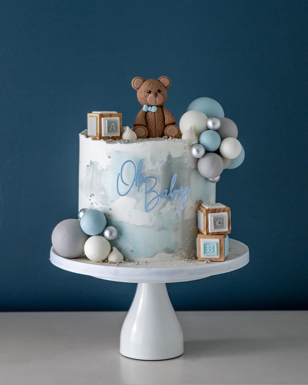 Plush, polished, and oh-so-precious — the Baby Bear Luxe cake is the ultimate showstopper for a sophisticated baby shower. Featuring dreamy watercolor buttercream in soothing shades of blue, silver, and ivory, this creation is crowned with a hand-crafted teddy bear in a dapper bow tie.