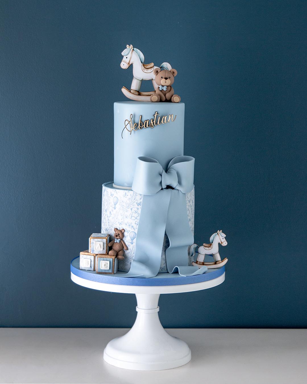 Finished with an oversized fondant bow and the baby’s name in gold, this cake is the perfect centerpiece to celebrate a baby boy’s grand entrance in style. Elegant, sweet, and unforgettable—just like your little one.