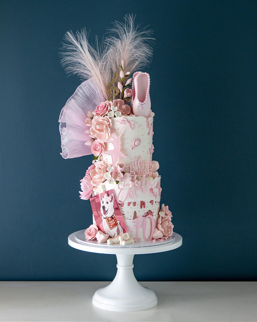 A dreamy, blush-pink ballerina cake designed with delicate florals, luxe textures, whimsical feathers, and a signature pointe-shoe topper. Ballet Dreams brings soft elegance and ballet-inspired charm to any celebration and can be personalized with custom portrait details.