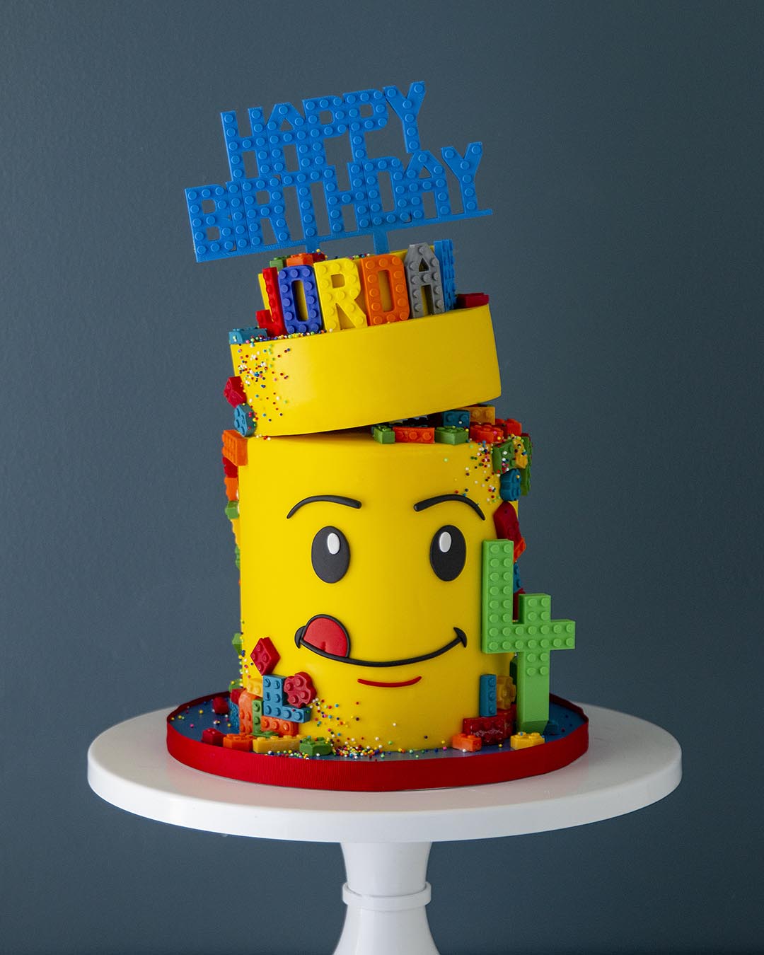 Stack up the fun with our Block Party cake — a bright, bold, and playful celebration that’s all smiles! Featuring a cheeky yellow face, a tilted top tier, and bursts of colorful “building blocks” tumbling down each side, this cake brings imagination to life.