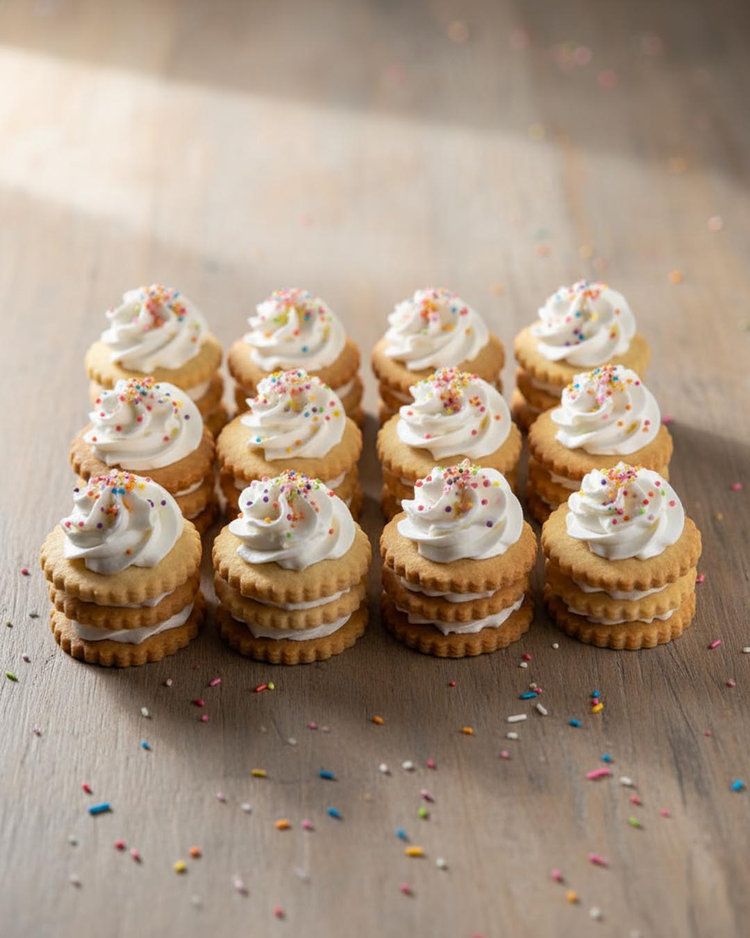 Each treat is built with buttery vanilla cookies stacked high with swirls of smooth vanilla cream, then topped with a playful dollop and rainbow sprinkles for that perfect celebration vibe.
