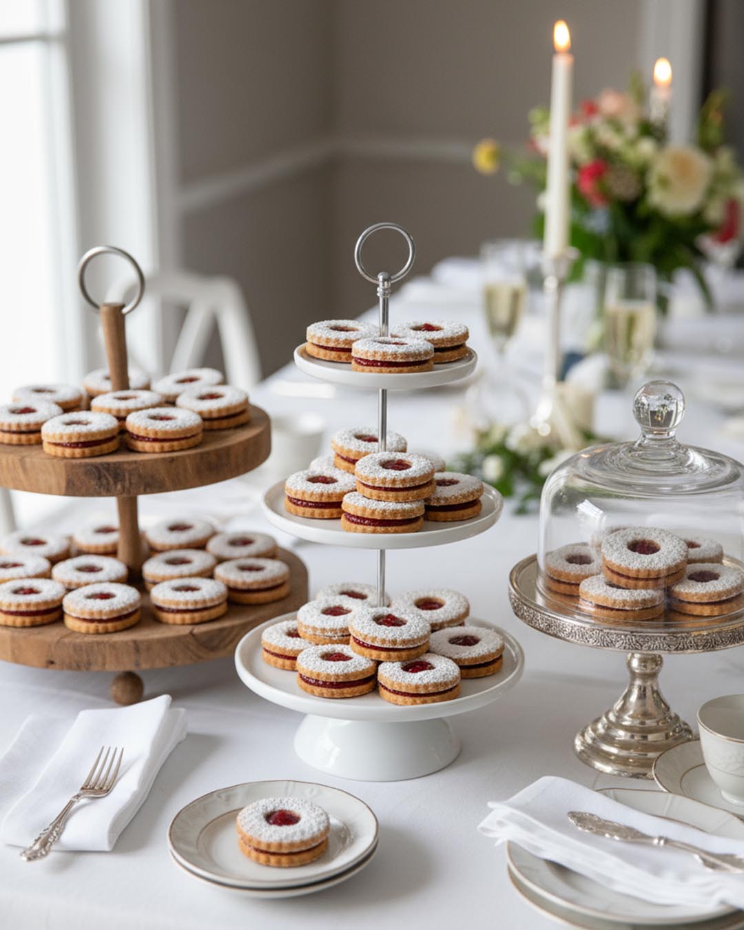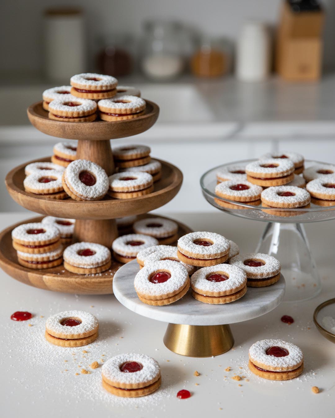 Our Raspberry Bullseye Cookies are buttery sandwich cookies filled with bright raspberry jam and dusted with a snowy layer of powdered sugar—creating that signature “bullseye” center everyone loves.