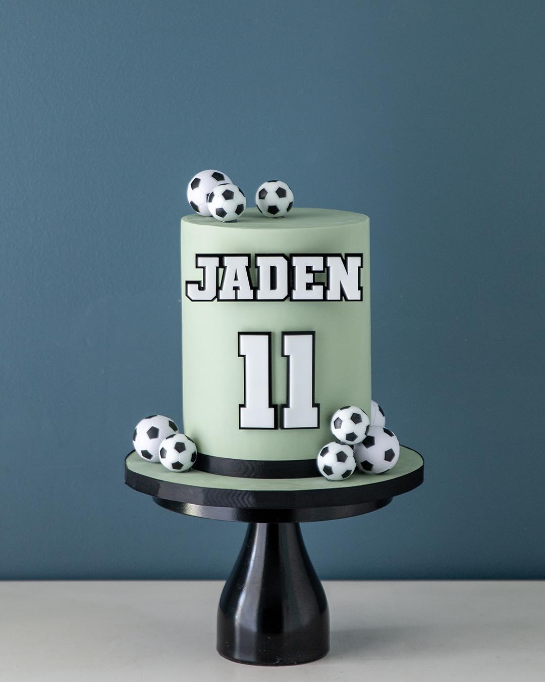 This sleek mint-green cake brings sporty style to the party with its bold jersey-inspired design. Featuring a custom name and number front and center, surrounded by playful fondant soccer balls and finished with a clean black trim, it’s the ultimate celebration cake for any soccer fan. A winning choice that scores every time!