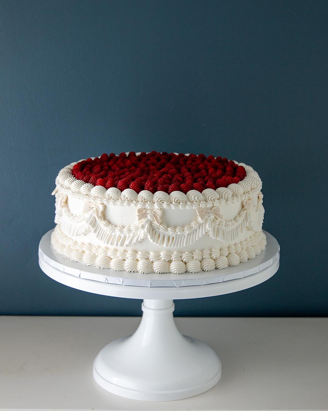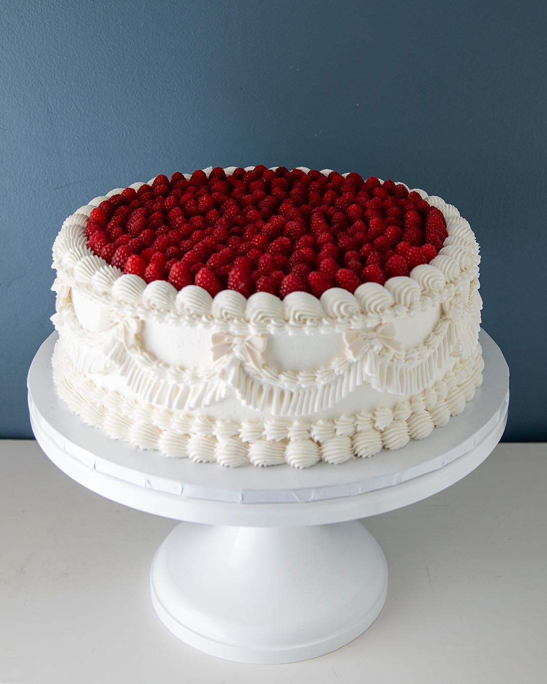 Raspberry Grand is a timeless celebration of romance. This elegant cake is adorned with delicate hand-piped details and crowned with a lavish layer of fresh raspberries, creating a striking balance of beauty and indulgence. Soft, classic finishes evoke bridal lace and heirloom charm, making it a stunning centerpiece for weddings, engagements, anniversaries, and elevated celebrations.