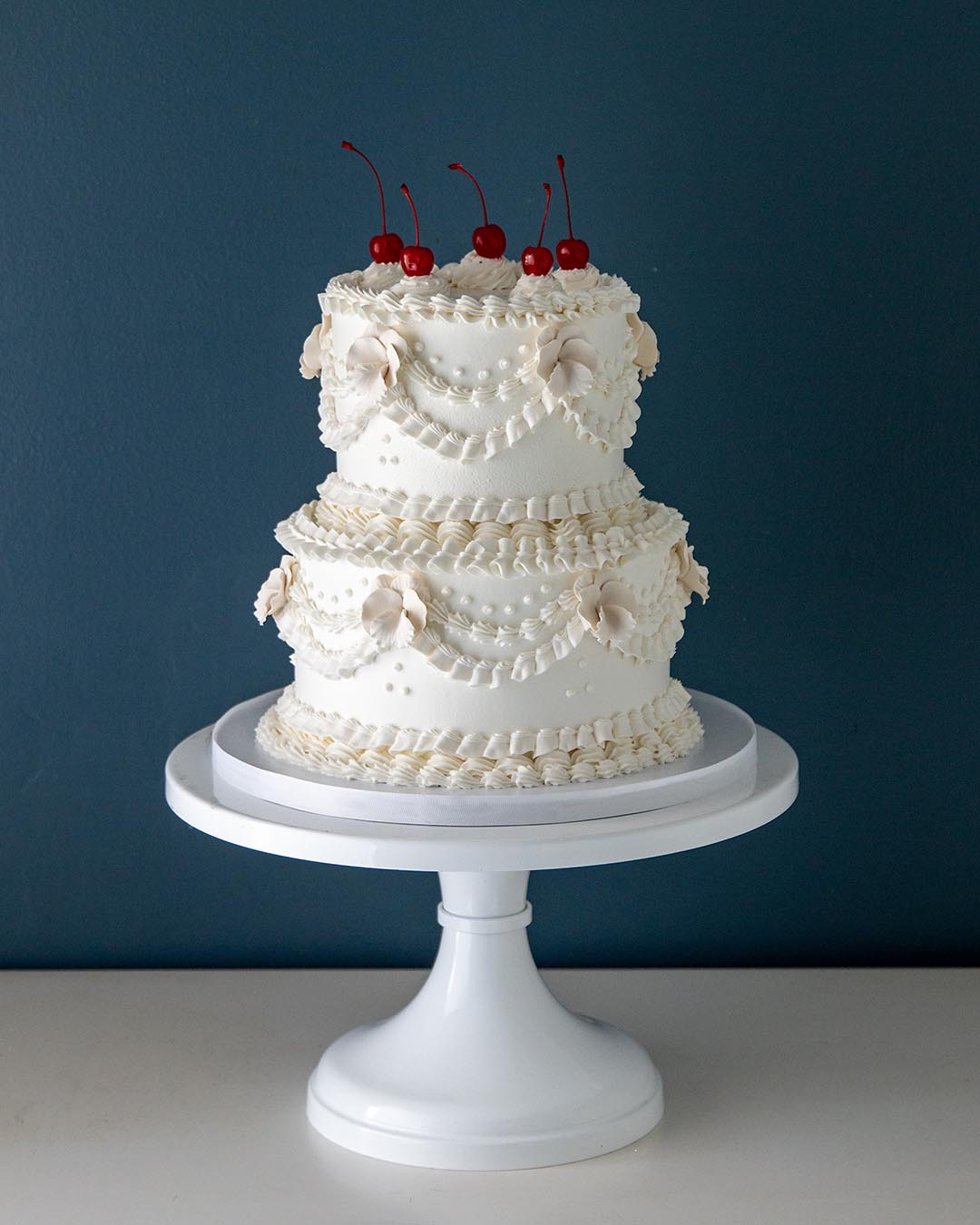 This beautifully handcrafted cake features soft buttercream adorned with intricate, lace-inspired piping and delicate vintage detailing. Finished with glossy cherries on top, it blends old-world charm with a refined, celebratory touch.