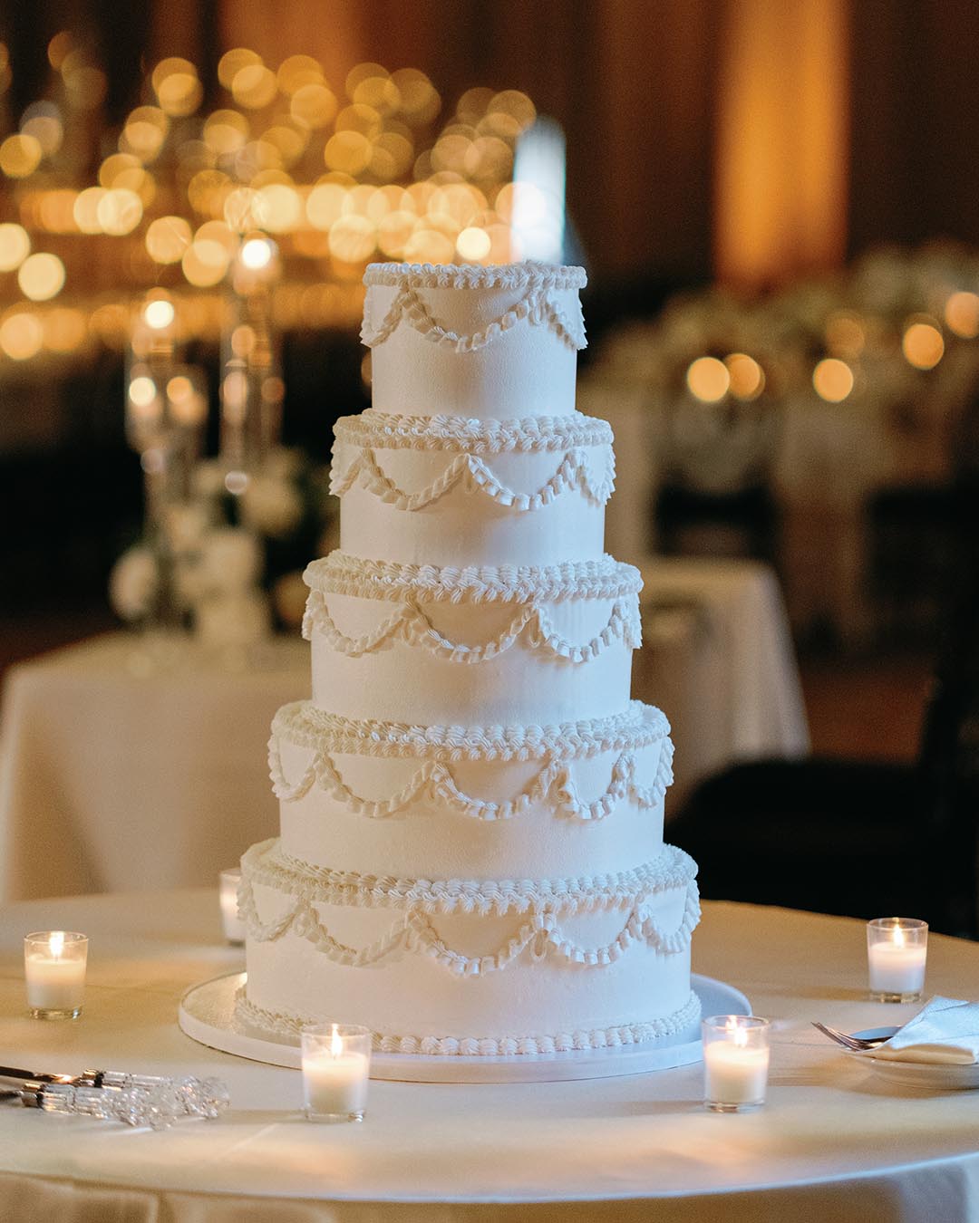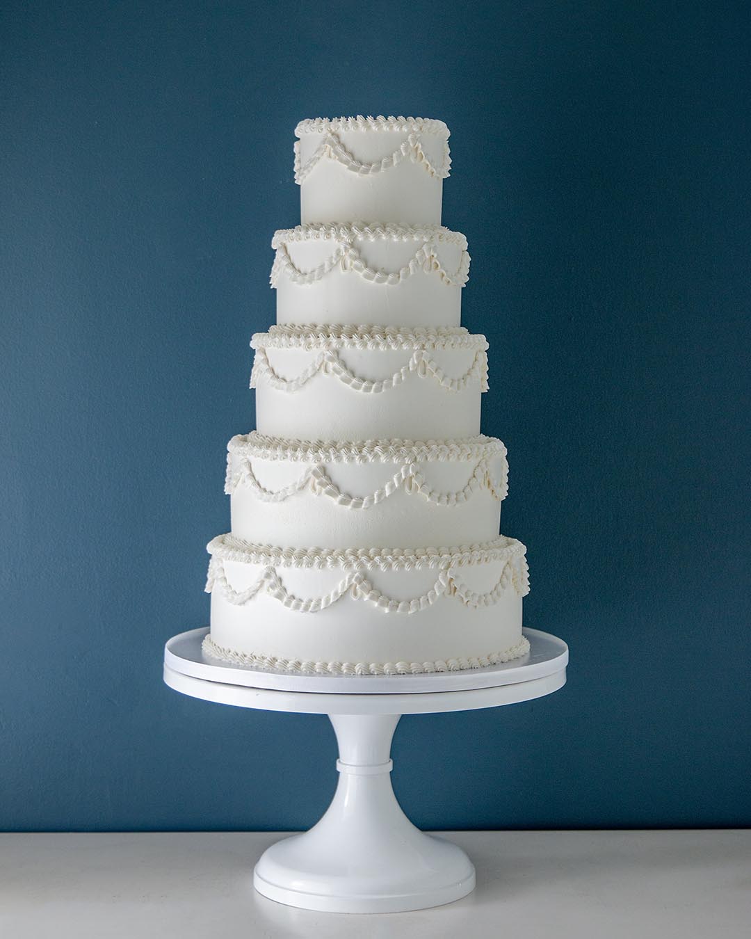 Each of the five pristine white tiers is meticulously hand-piped into graceful swags and ornate shell borders, evoking the handcrafted grandeur of a bygone era.