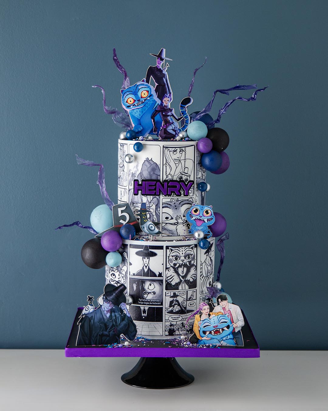 Enter a world of mystery, magic, and bold visual storytelling with Dark Zero, a dramatic two-tier celebration cake inspired by fantasy comics and supernatural adventure.
