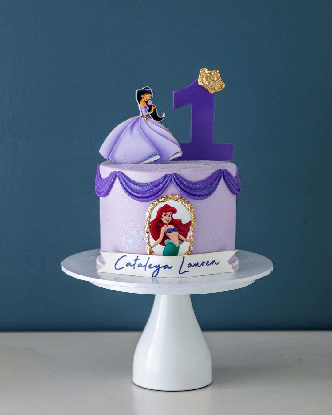 This shimmer-coated smash cake is perfect for your little royal’s big day, complete with purple fondant draping, fairytale princess details, and a crown-topped number one. Whether she’s under the sea or dancing in the castle, this cake brings all the birthday magic.